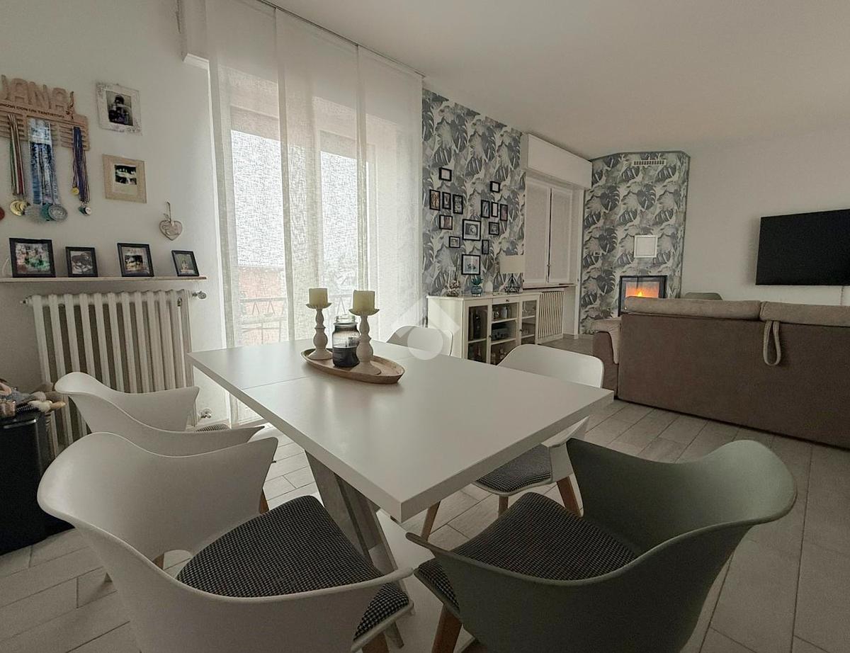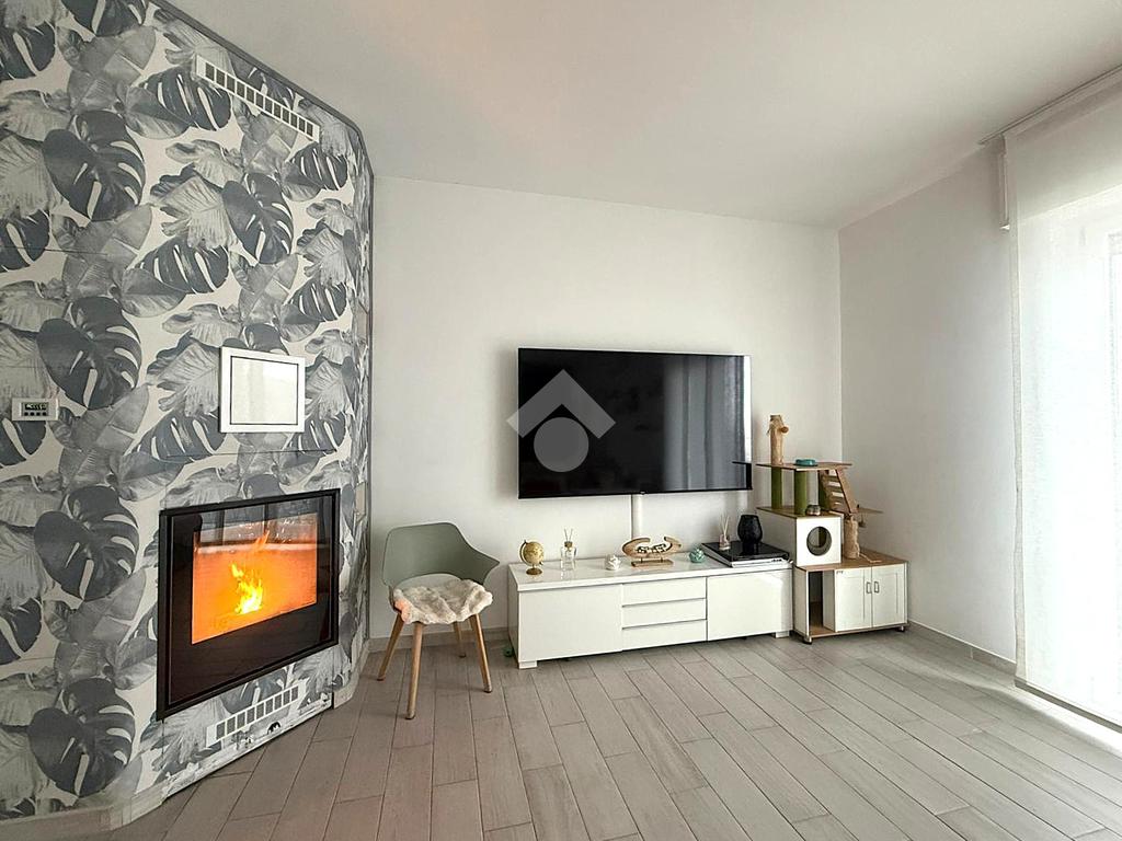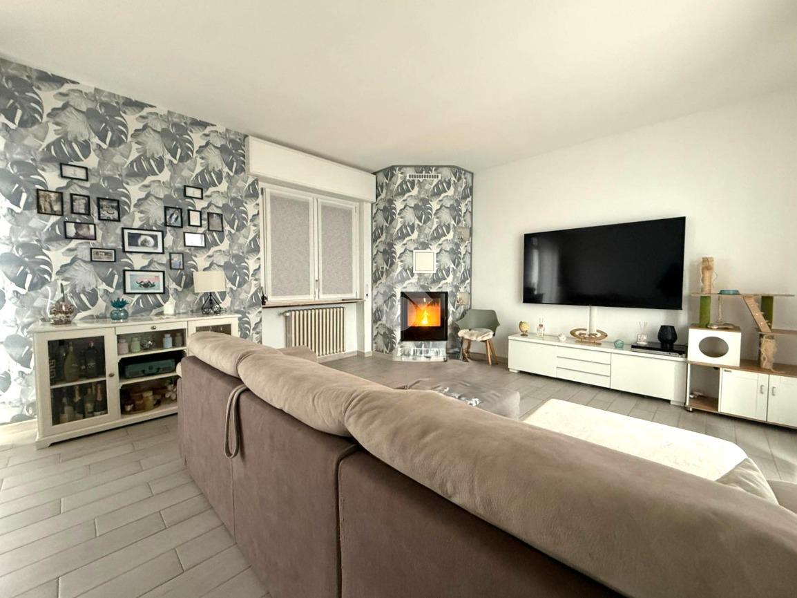 L'ingresso conduce ad un soggiorno di generosa metratura, impreziosito da camino termo-riscaldante a pellet e dalla presenza di due ampi balconi che conferiscono grande luminosità all'ambiente.