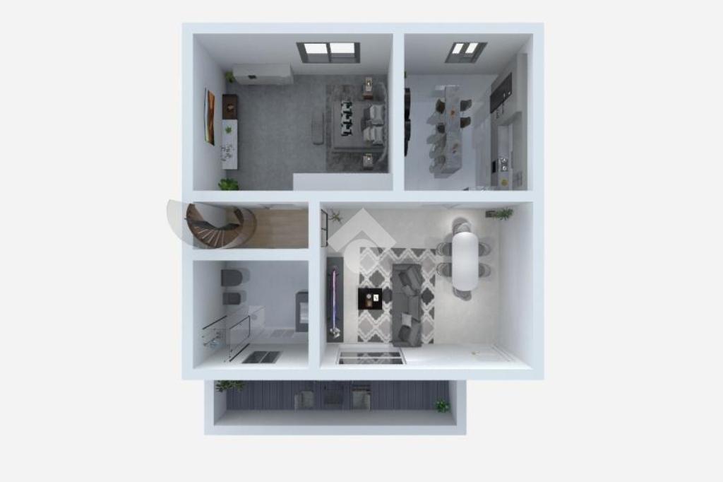L'appartamento, situato al piano secondo ed ultimo, è disposto su due livelli. Dispone, al piano secondo, di una zona giorno composta da soggiorno e cucina abitabile, una camera da letto ed un servizio finestrato. Un terrazzino privato offre uno spazio esterno esclusivo, perfetto per momenti di relax. Il piano superiore ospita 3 locali hobby utilizzabili come camere da letto o locali studio/guardaroba, oltre ad un secondo servizio finestrato.