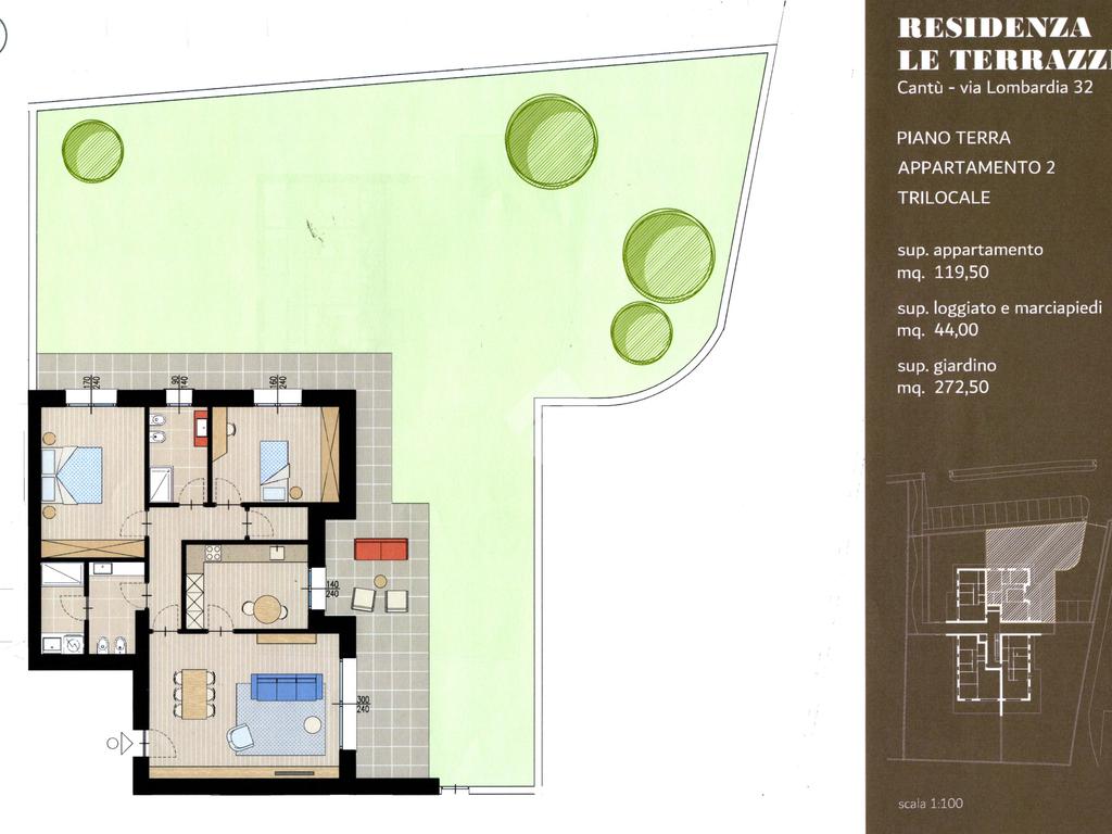 Ampio trilocale al piano terra composto da cucina abitabile luminosa, grande soggiorno, doppi servizi, camera matrimoniale spaziosa e molto luminosa e cameretta.