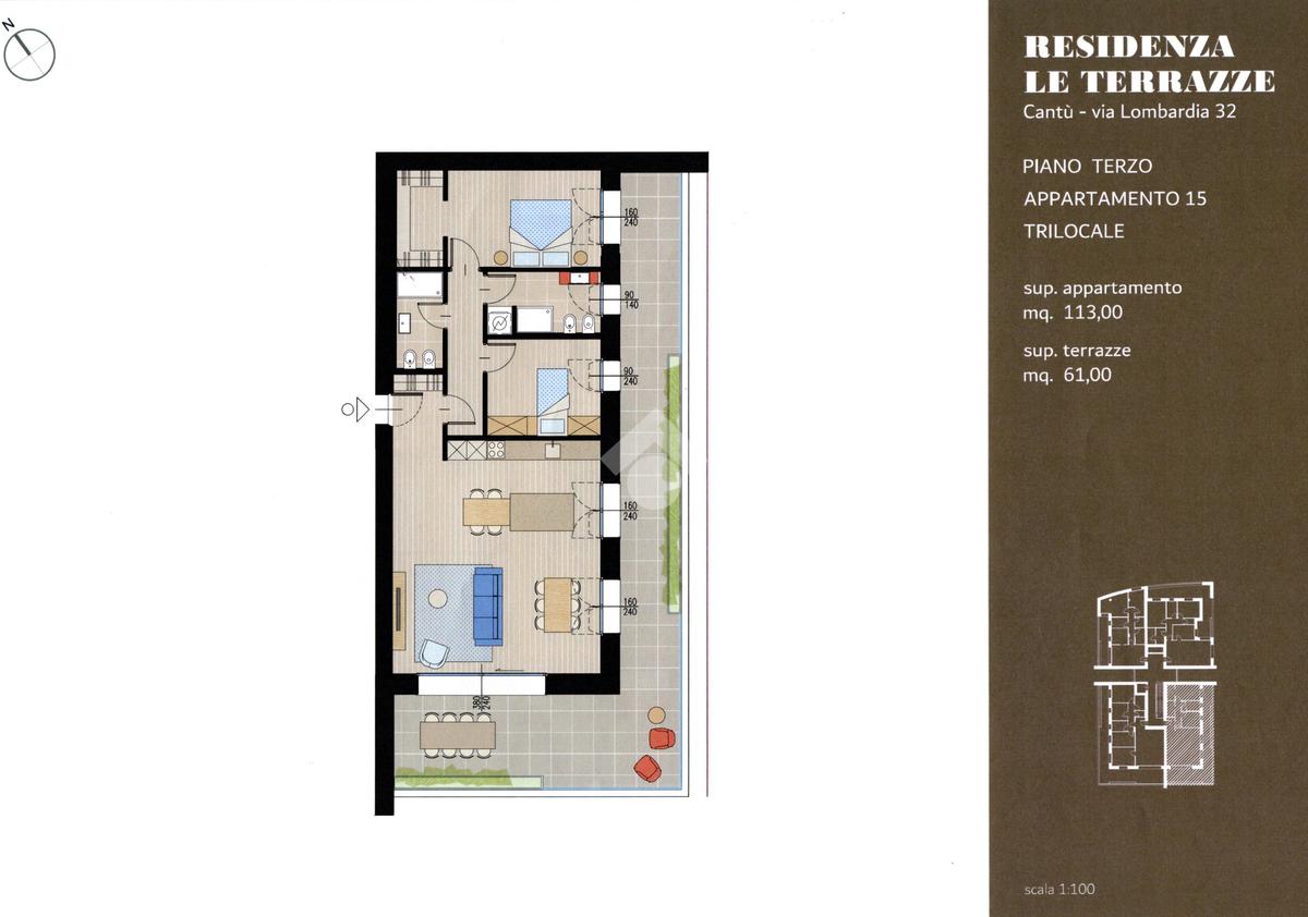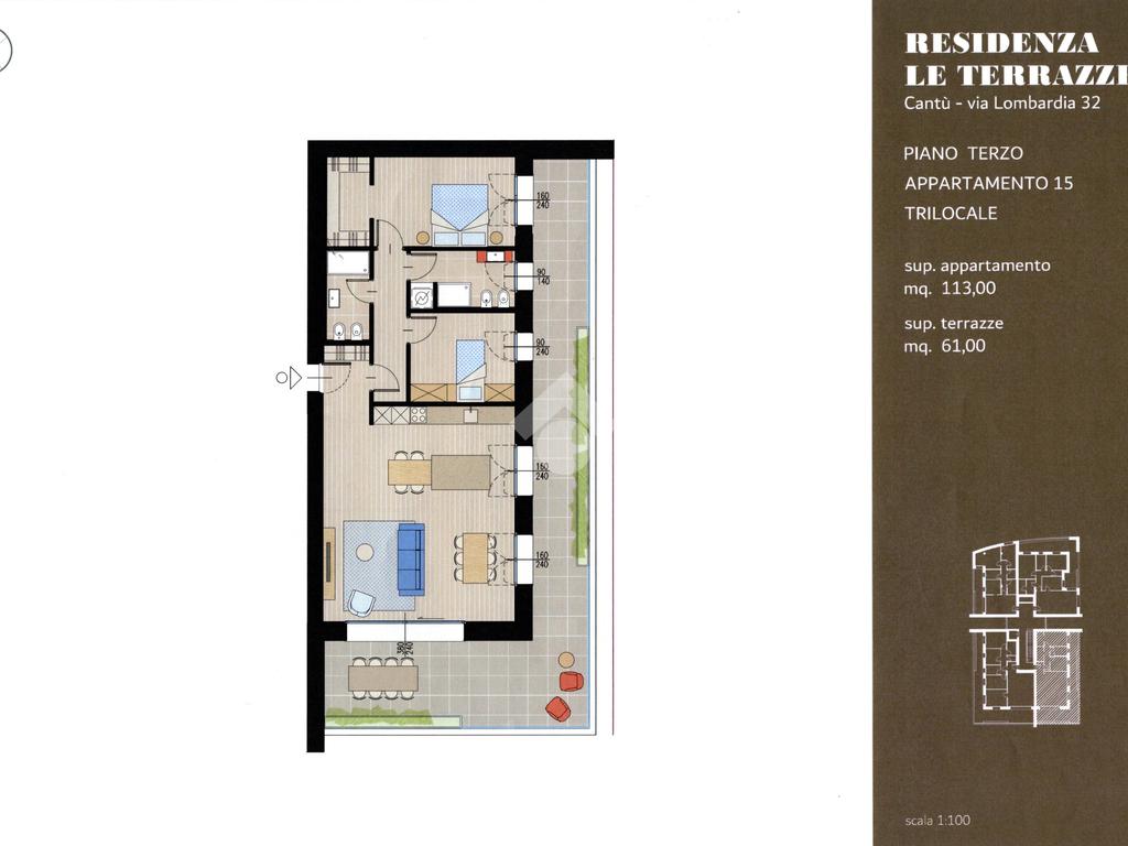 Ampio trilocale al piano terzo composto da soggiorno open space con cucina a vista, doppi servizi, camera matrimoniale spaziosa e molto luminosa e cameretta. Il vero valore aggiunto dell’abitazione è il terrazzo privato di 61 mq, ideale per vivere momenti di relax all’aria aperta.